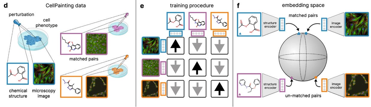 Similar to COATI, which we featured in newsletter #16, CLOOME uses contrastive learning, embedding bio images and chemical structures into a common latent space using encoders. This approach allows linking a given chemical structure with an image of a biological phenomenon, and can greatly help understand biological effects of molecules. Their model also shows transferability to other drug discovery tasks, making it a step toward a foundation model for microscopy images.