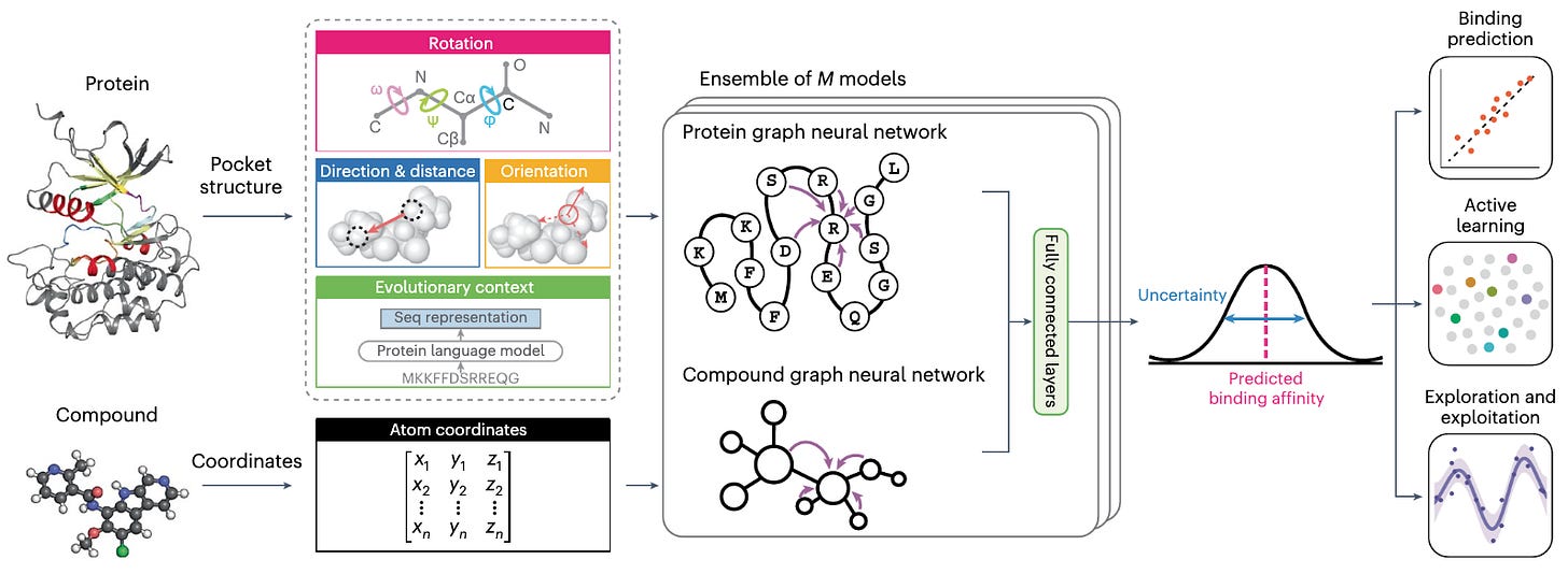Protein kinases are important: they regulate a range of cellular functions, and kinase inhibitors are one of the largest group of approved drugs. This study presents KDBNet, a model for learning binding affinity between kinases and compounds. By integrating 3D structure information from both kinase binding pocket and molecule into graph neural networks, they get better accuracy in predicting drug-kinase binding affinity compared to 1D or 2D featurizing methods. KDBNet can also exploit uncertainty estimates to guide the learning process.