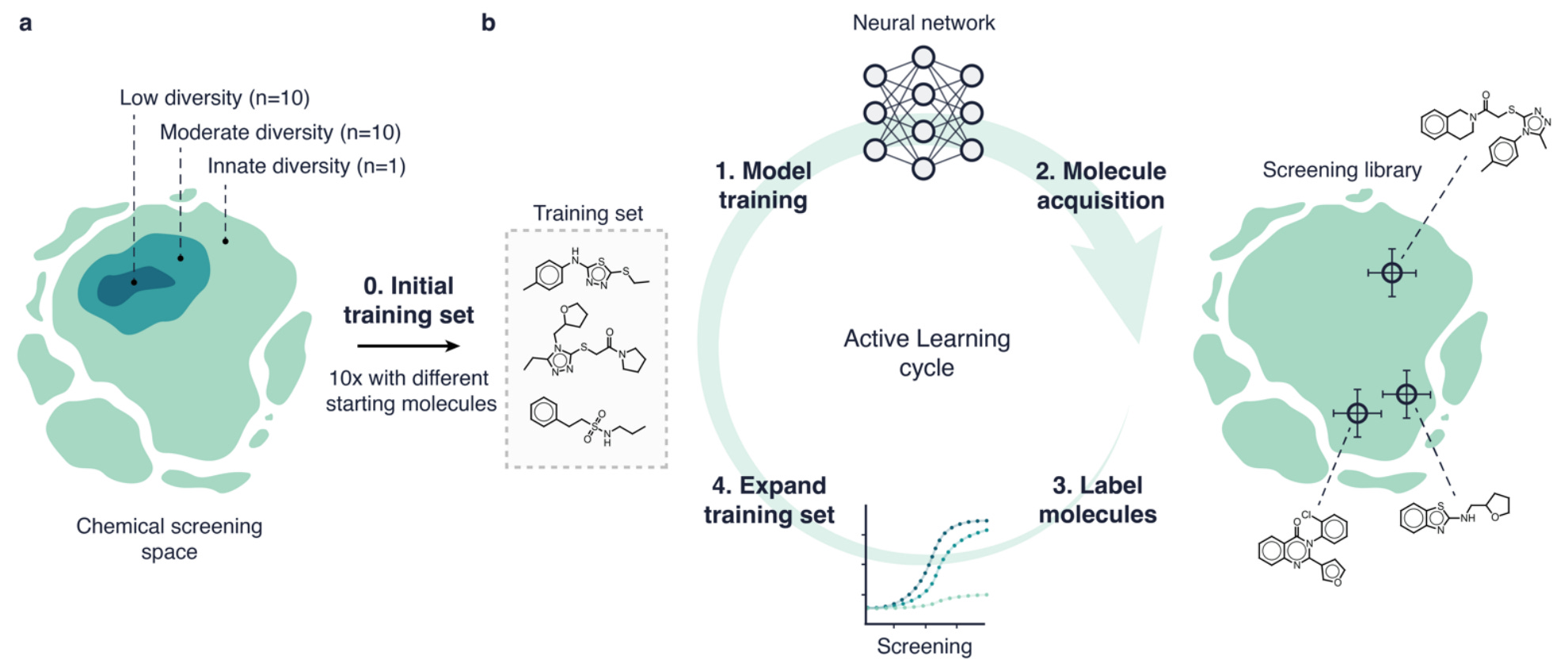 Machine learning is limited by the data, and in drug screening there’s often fewer samples and less molecular diversity. Active learning can help by iteratively updating a model by querying a limited set of molecules at a time. This study compared six different active learning strategies and two deep learning models. They found that the strategy to acquire molecules was the primary driver of performance, but that active learning could give up to a six-fold improvement in hit retrieval compared to traditional methods in a low-data scenario.